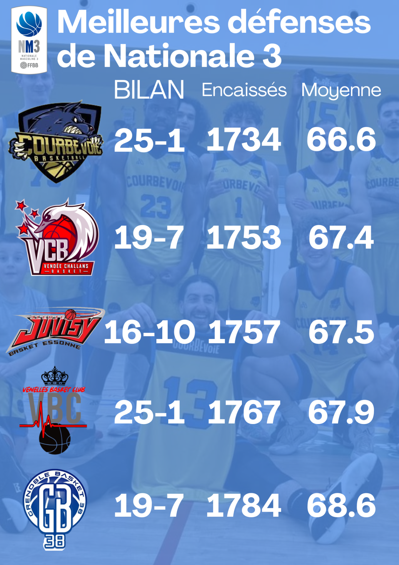+45 face à St-Marie aux Chênes, un tir du l'autre bout du terrain pour l'emporter 66-65 face à Roncq (candidat très sérieux à la montée), +36 contre l'AS Bon Conseil. Les équipes du Grand Est sont les victimes préférées de Courbevoie : 101-53 face à Longwy et 110-52 contre Joeuf avant de prendre une revanche face à Juvisy (victoire 83-75). Courbish a rarement été mis en difficulté cette saison.