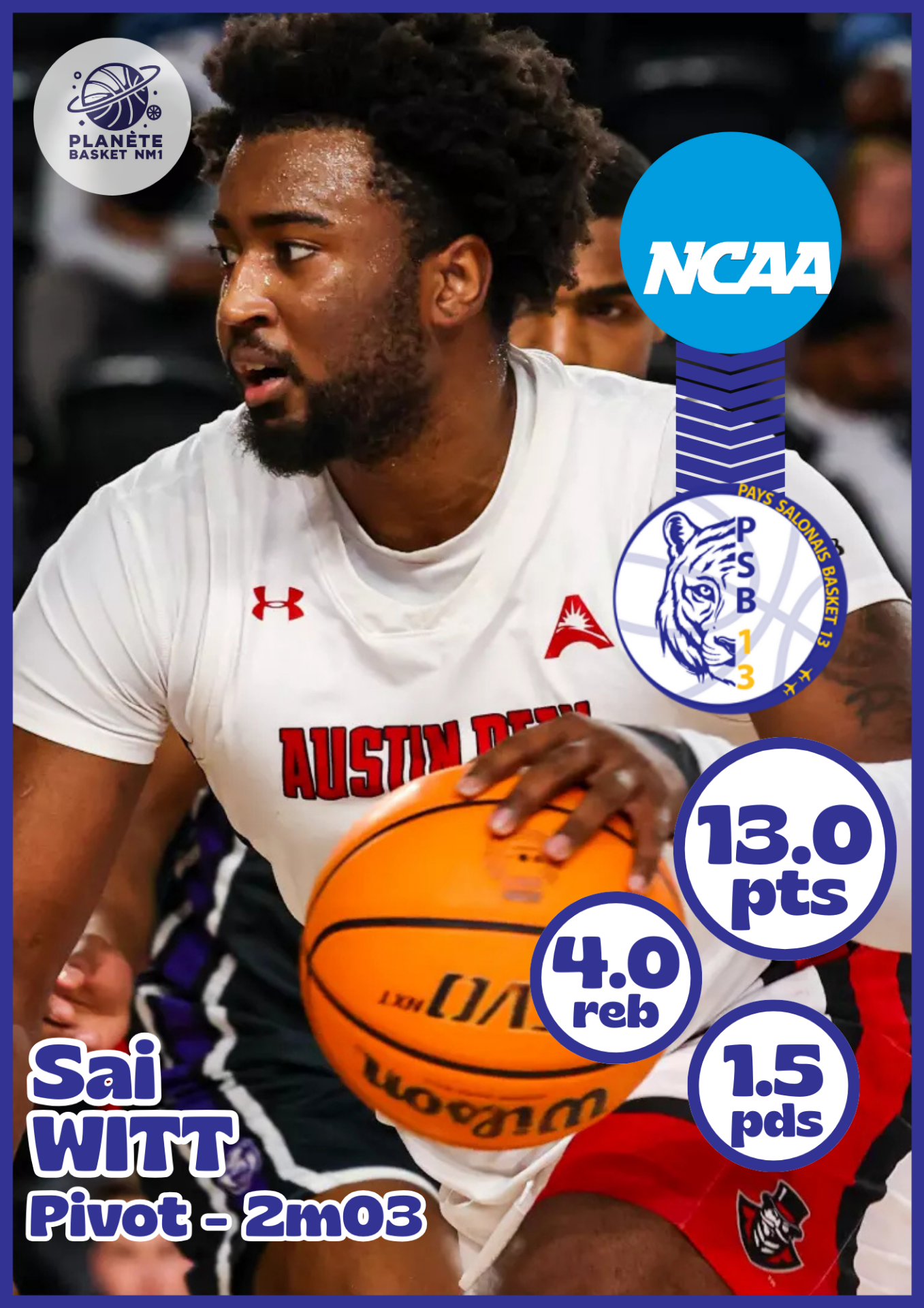 Pour compléter la raquette, les Tigers ont misé sur Sai Witt. Le pivot américain sort de deux saisons très convaincantes en NCAA avec les Austin Peay Governors et sera donc le seul étranger dans l'effectif de Sébastien Cherasse. On espère pour le PSB13 que cette recrue étrangère sera aussi dominante que Lathaniel Bastian.